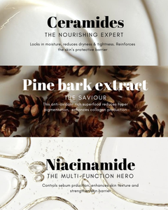 PINE BARK EXTRACT:It helps to maintain skin hydration by supporting the skin barrier function, preventing moisture loss and promoting a smoother, more supple complexion.